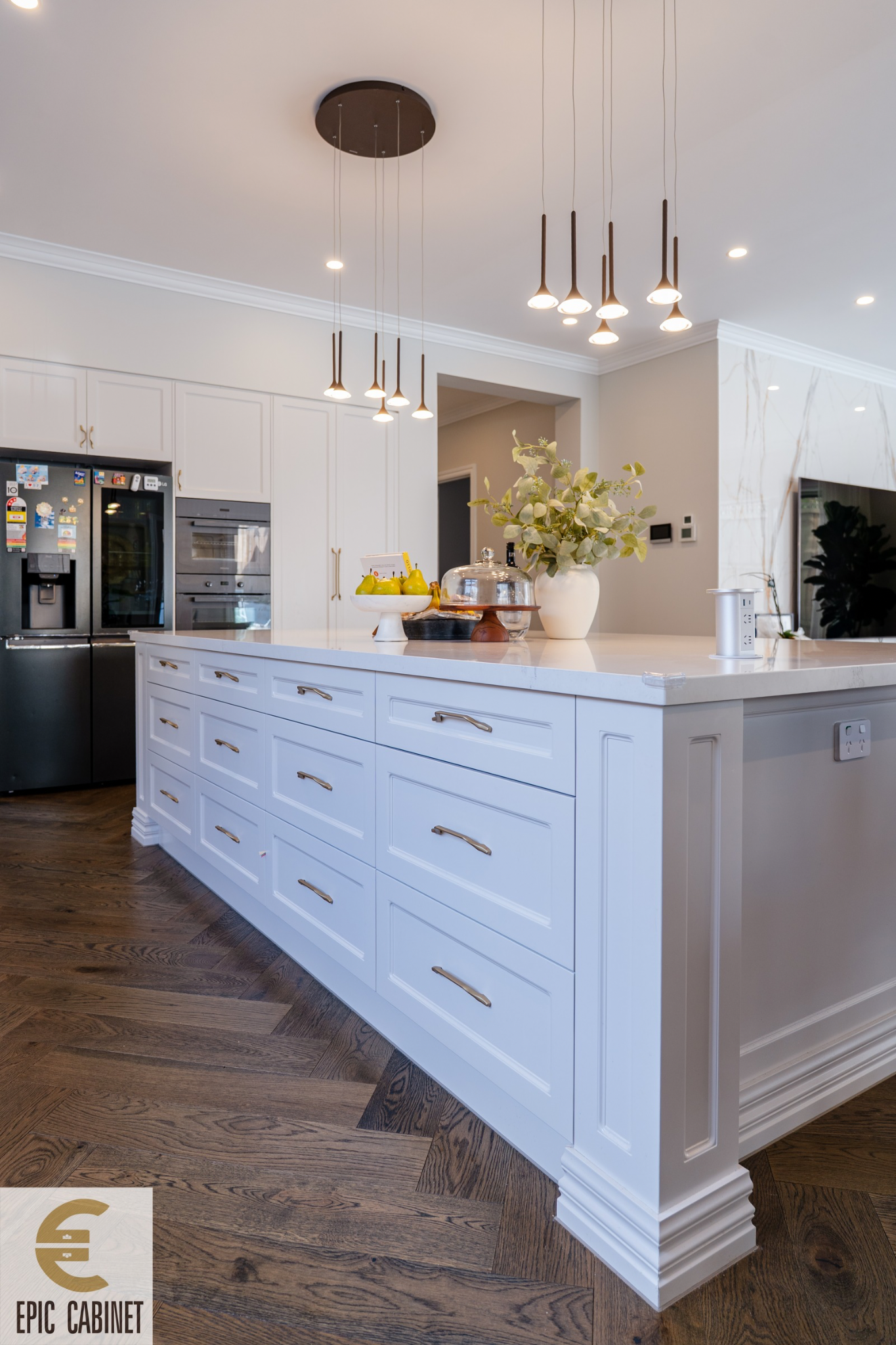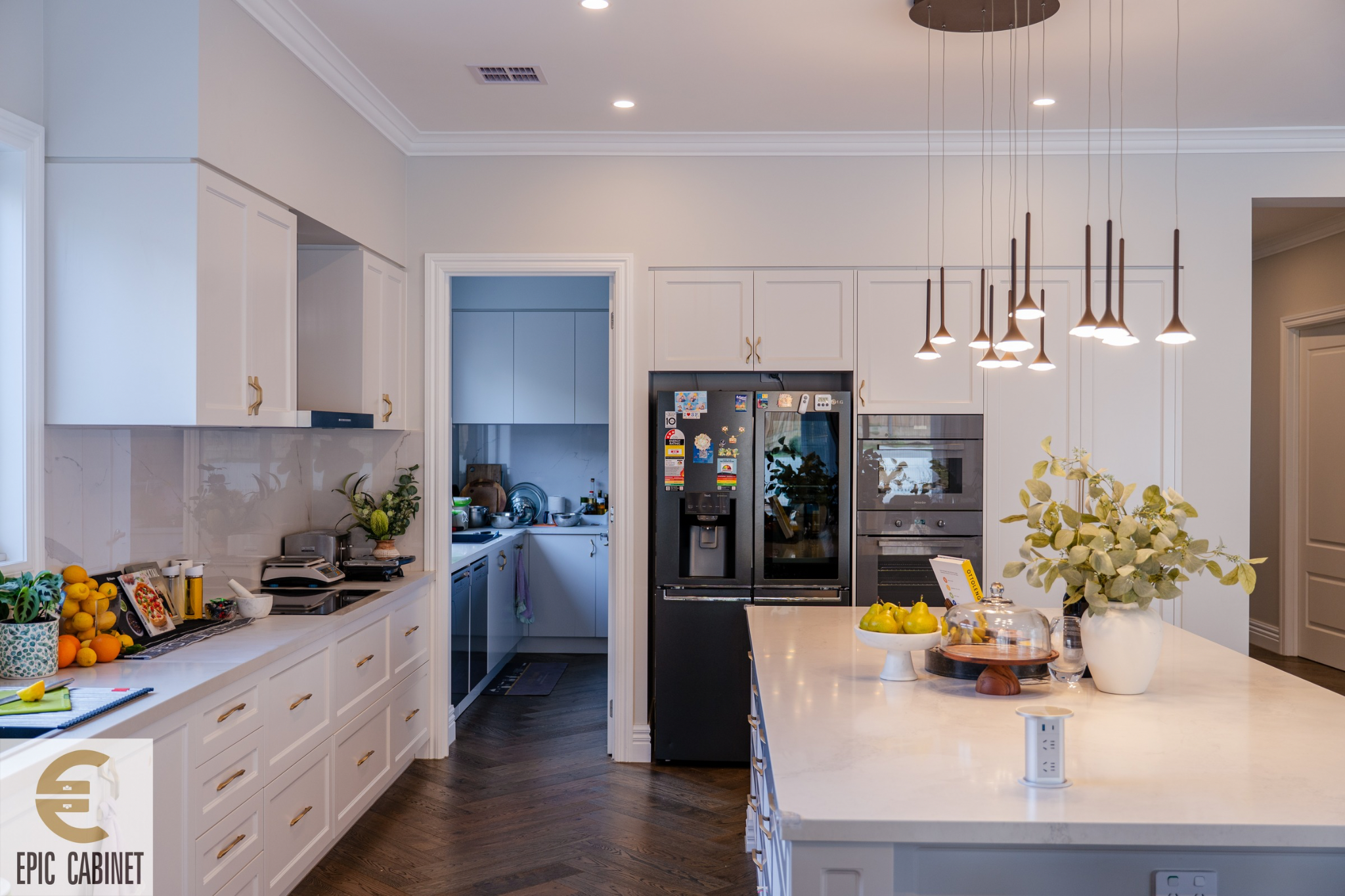 - Elegant paneled cabinetry: Classic shaker-style doors with subtle moulding and brass knobs evoke traditional French refinement.