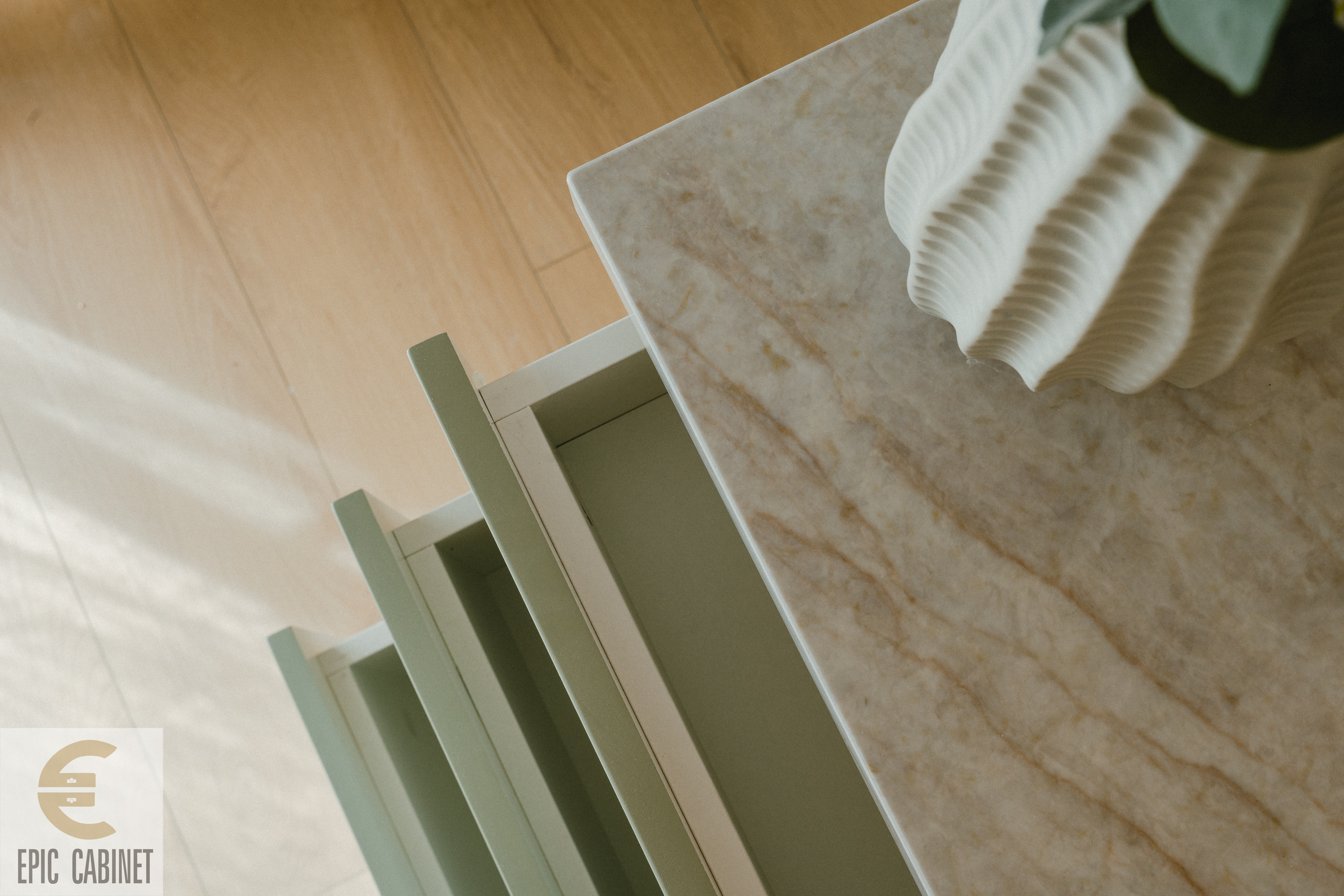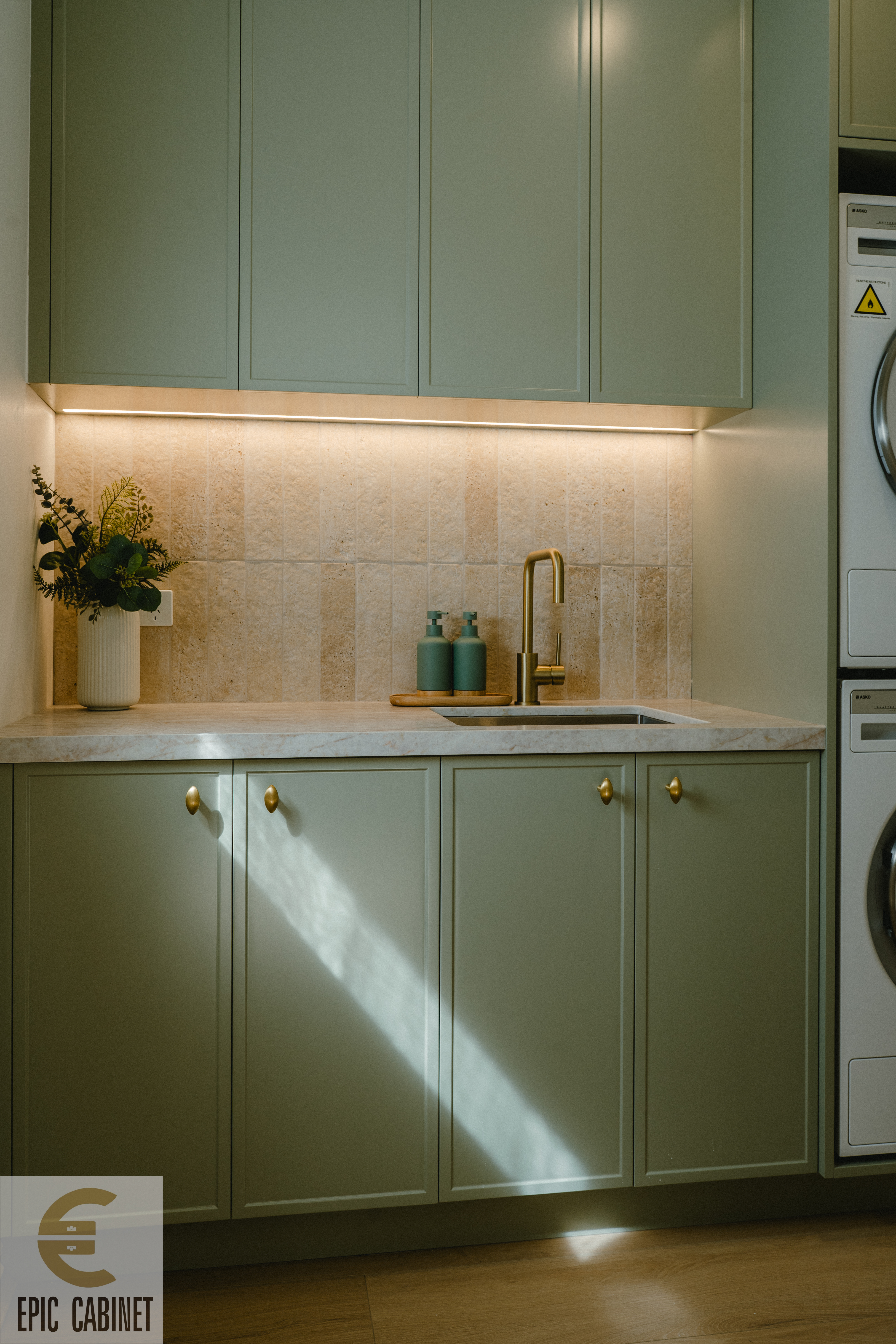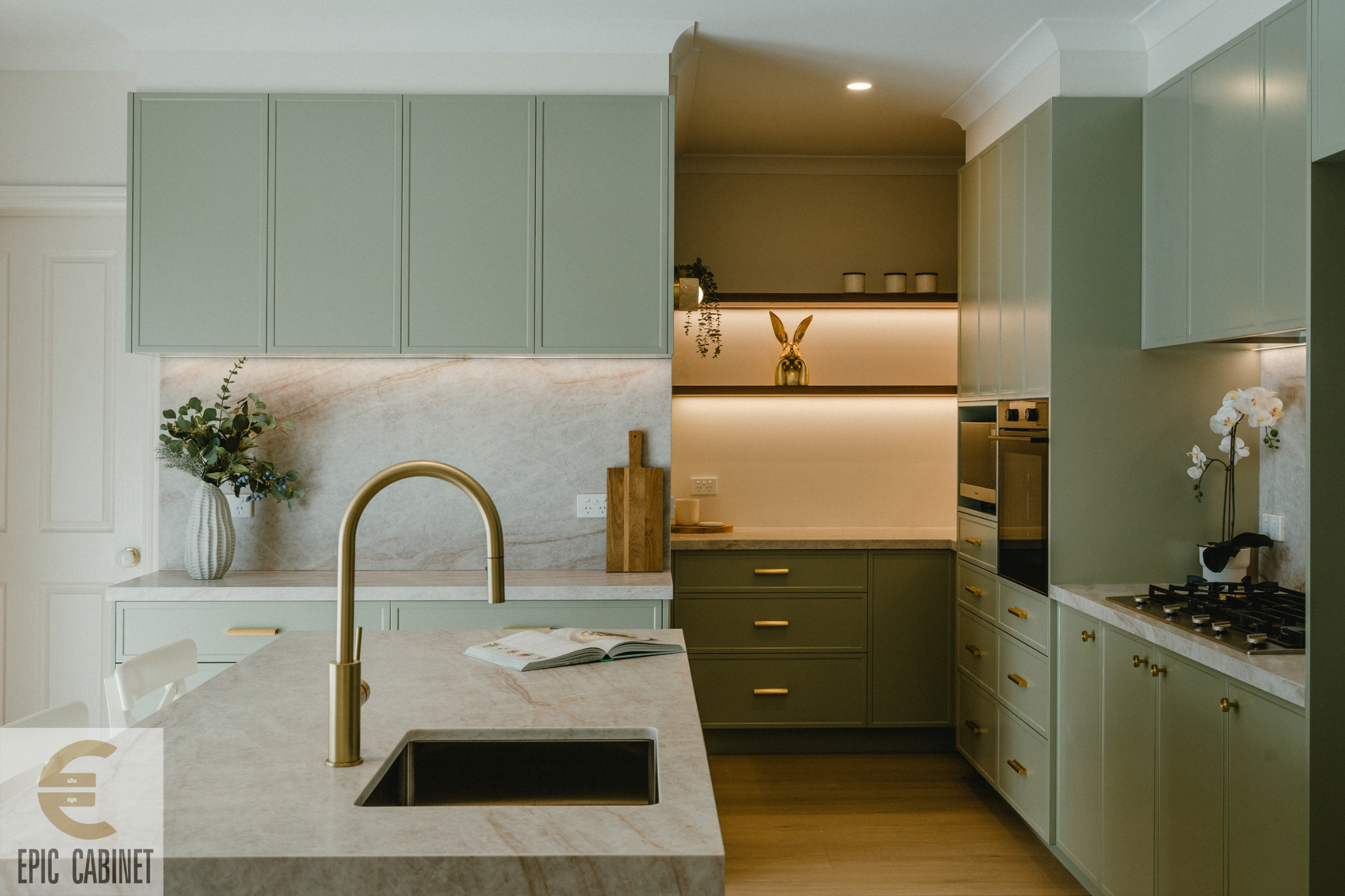 - Warm brass accents: Brushed brass faucet, pulls, and knobs add warmth and a refined contrast against the green.