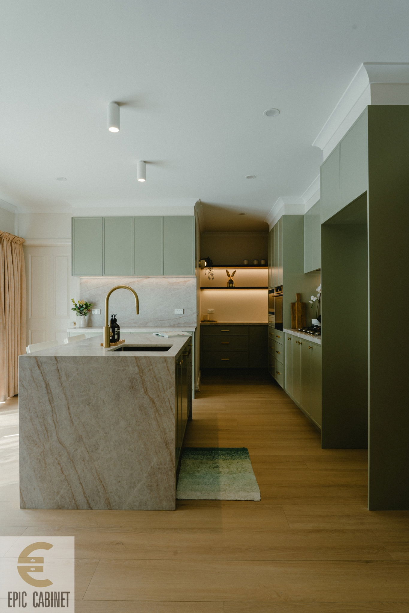 - Signature Moreland Greens palette: Soft, sage-green cabinetry sets a calm, contemporary tone and brings a natural, organic feel to the space.
