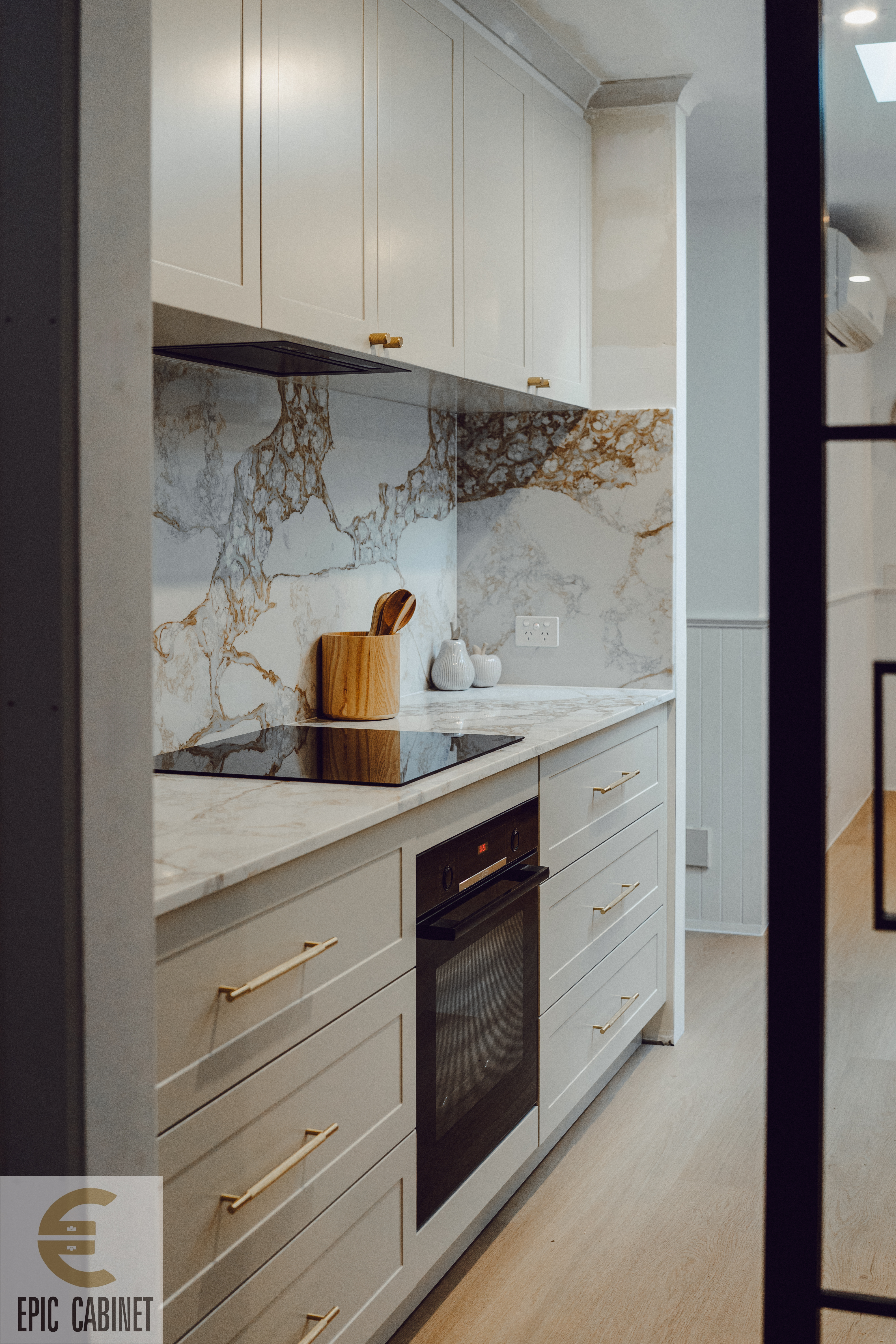 • Refined Oro Lusso stone: Glossy white base with flowing gold and grey veining creates a subtle, luxurious centerpiece across benchtop and splashback.
