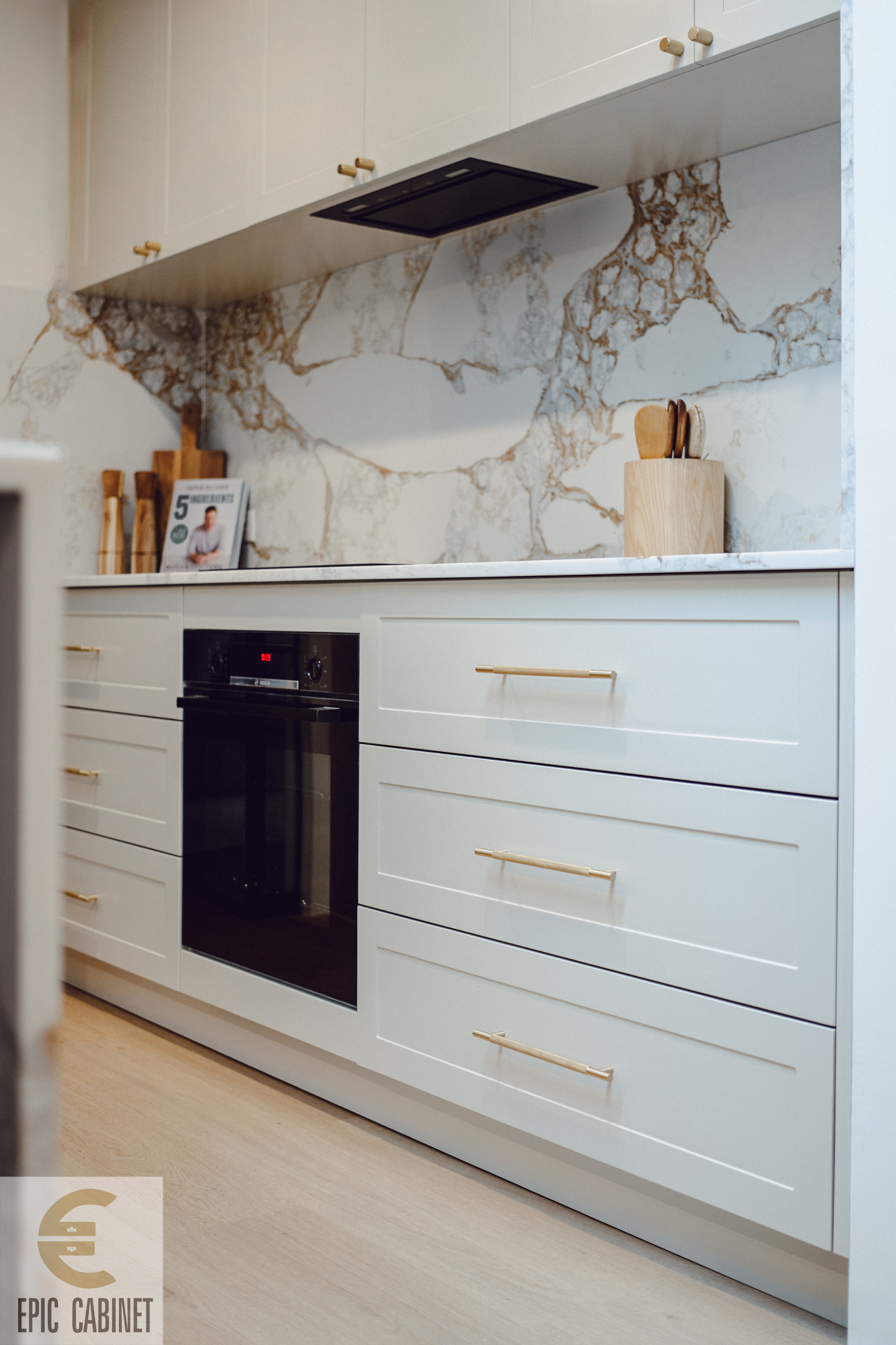 • Brushed brass hardware: Slim, warm-toned handles add a touch of modern glamour without overpowering the space.