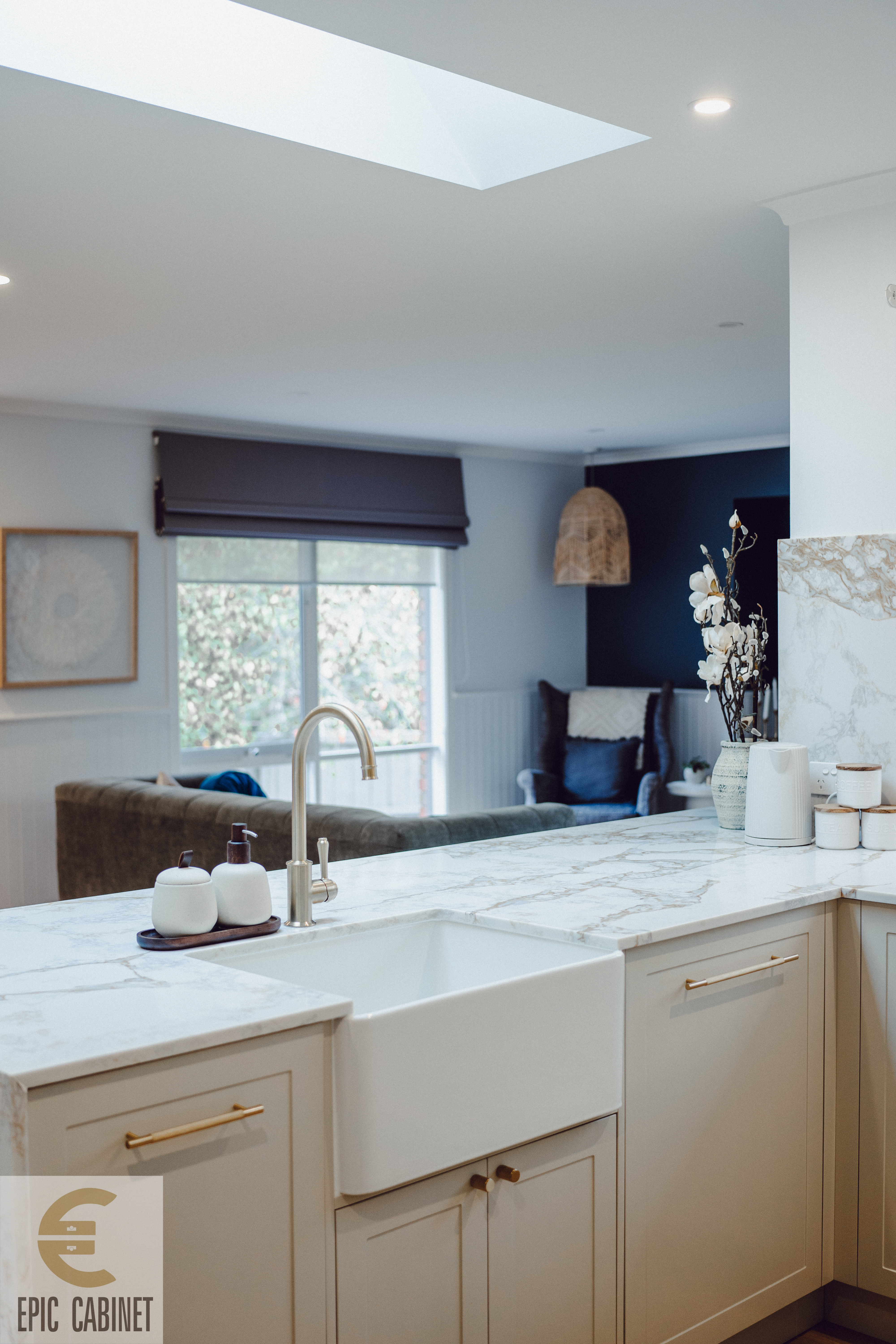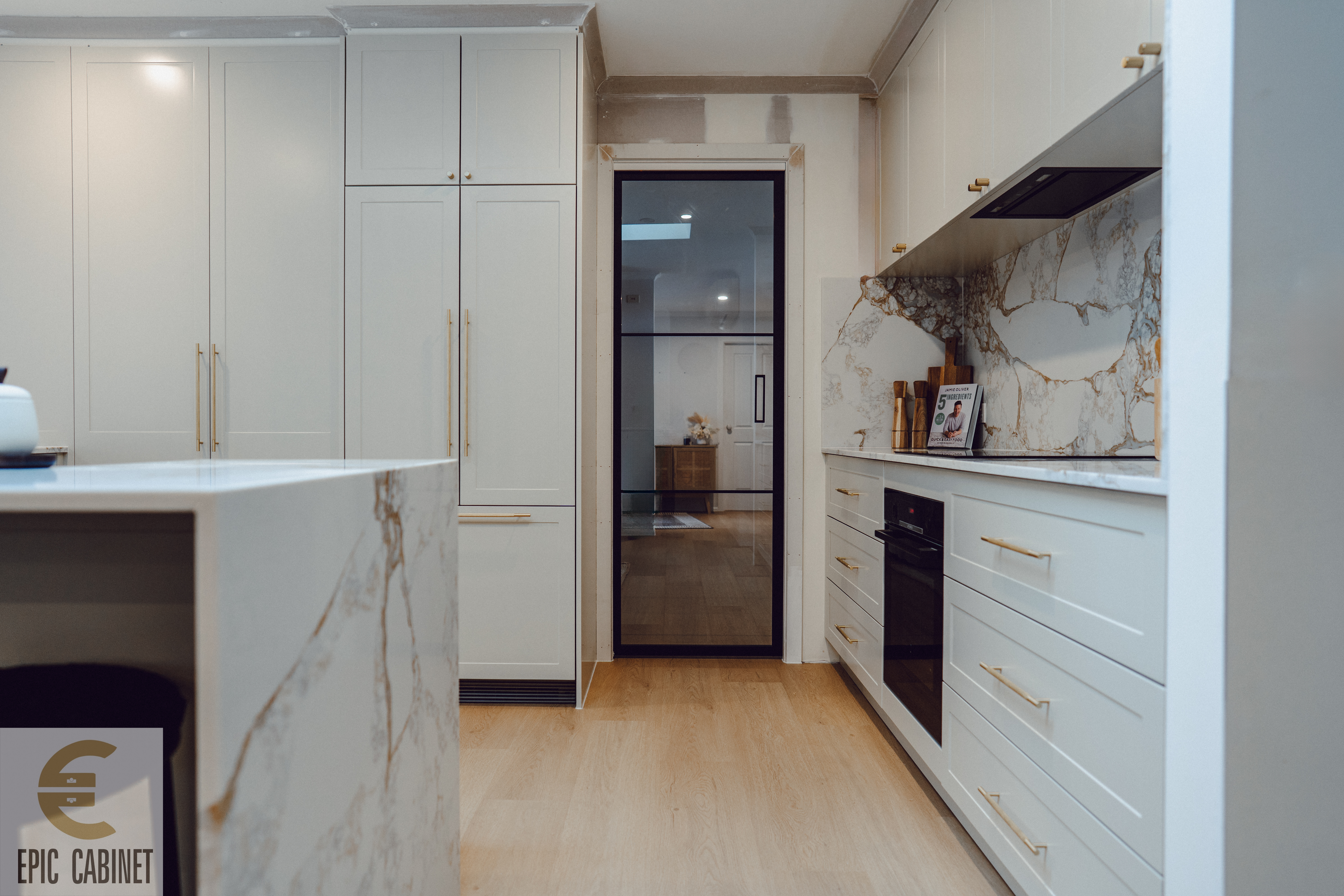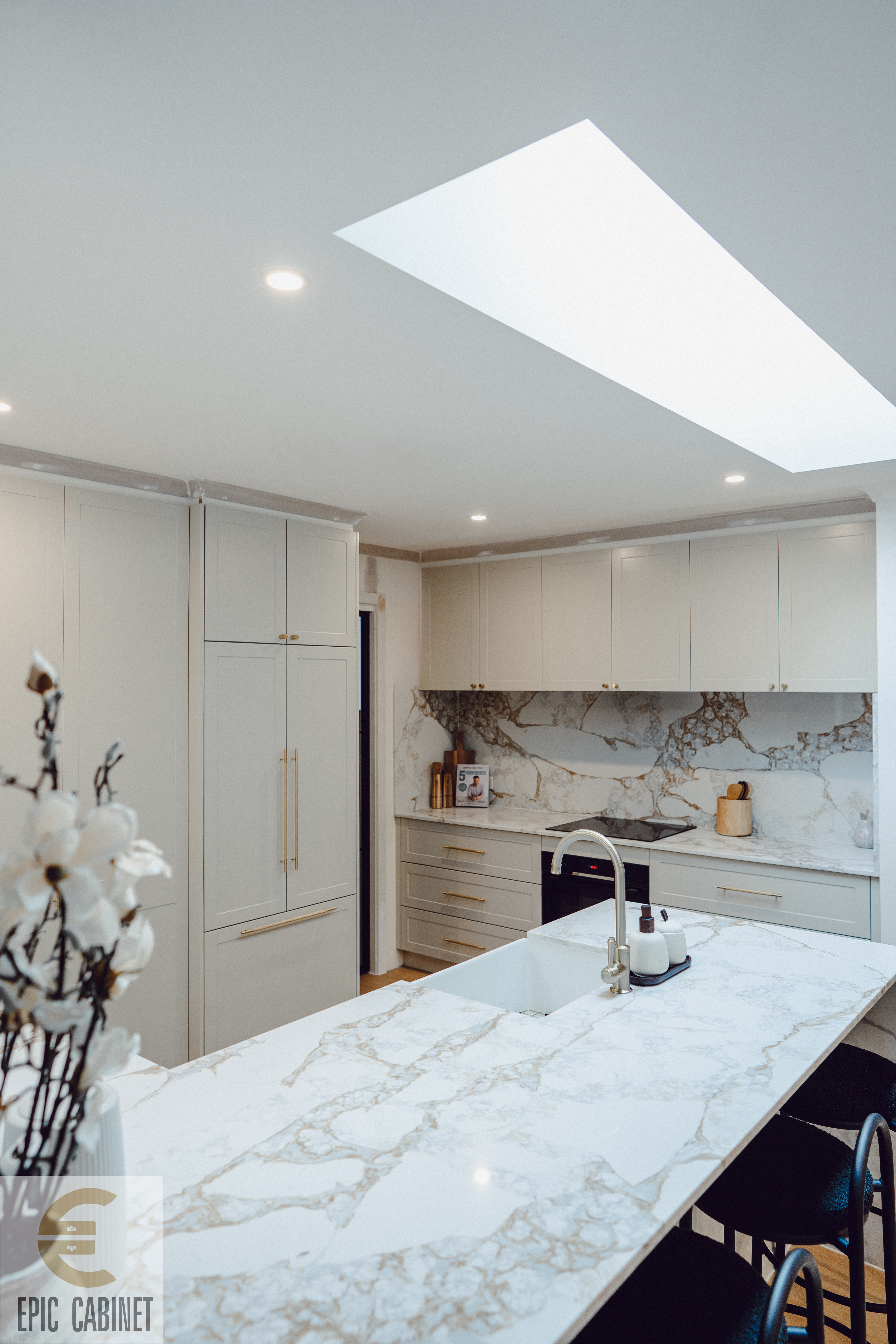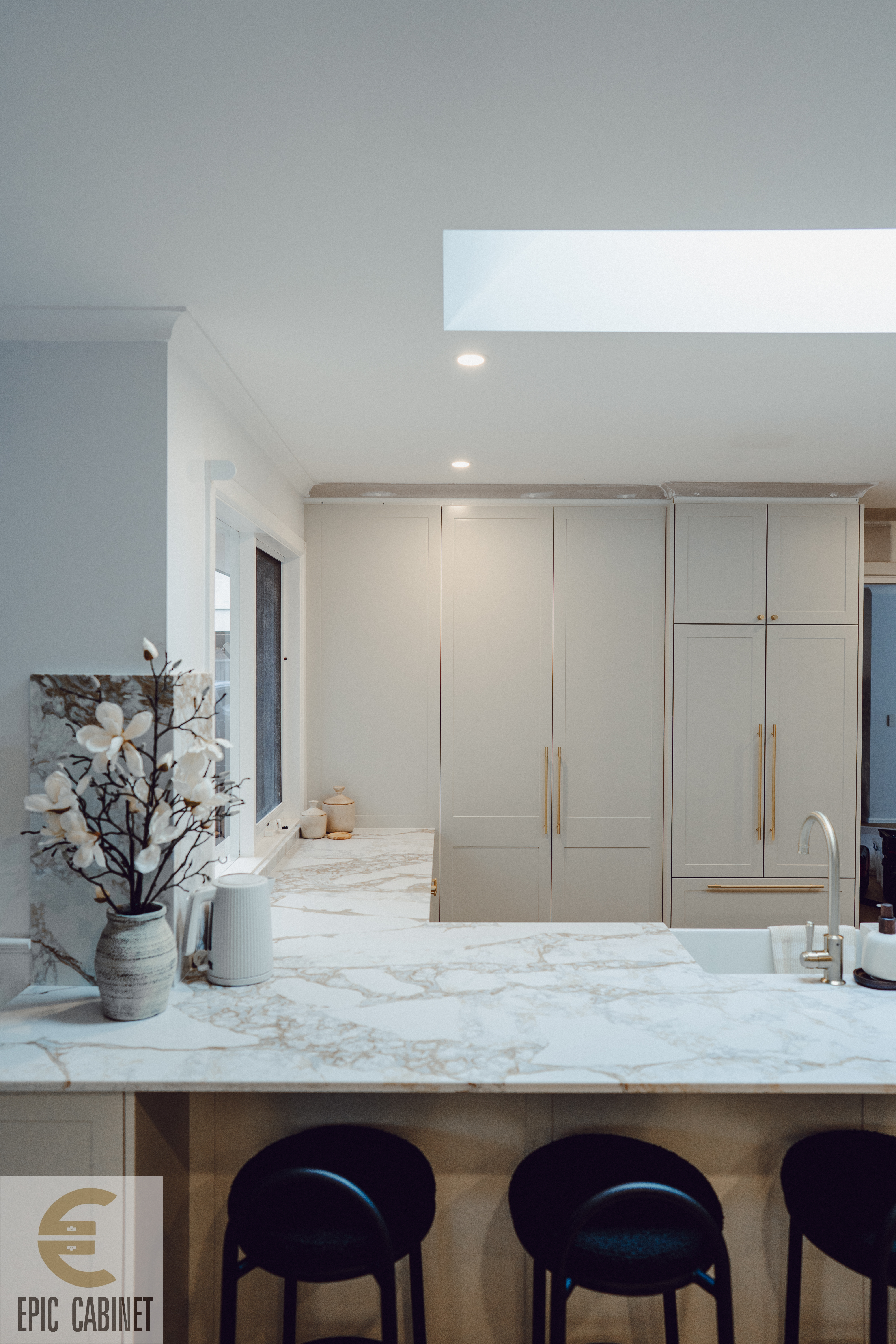 • Elegant, cohesive cabinetry: Soft cream, full-height cabinets with clean lines and integrated panels deliver a seamless, high-end look.