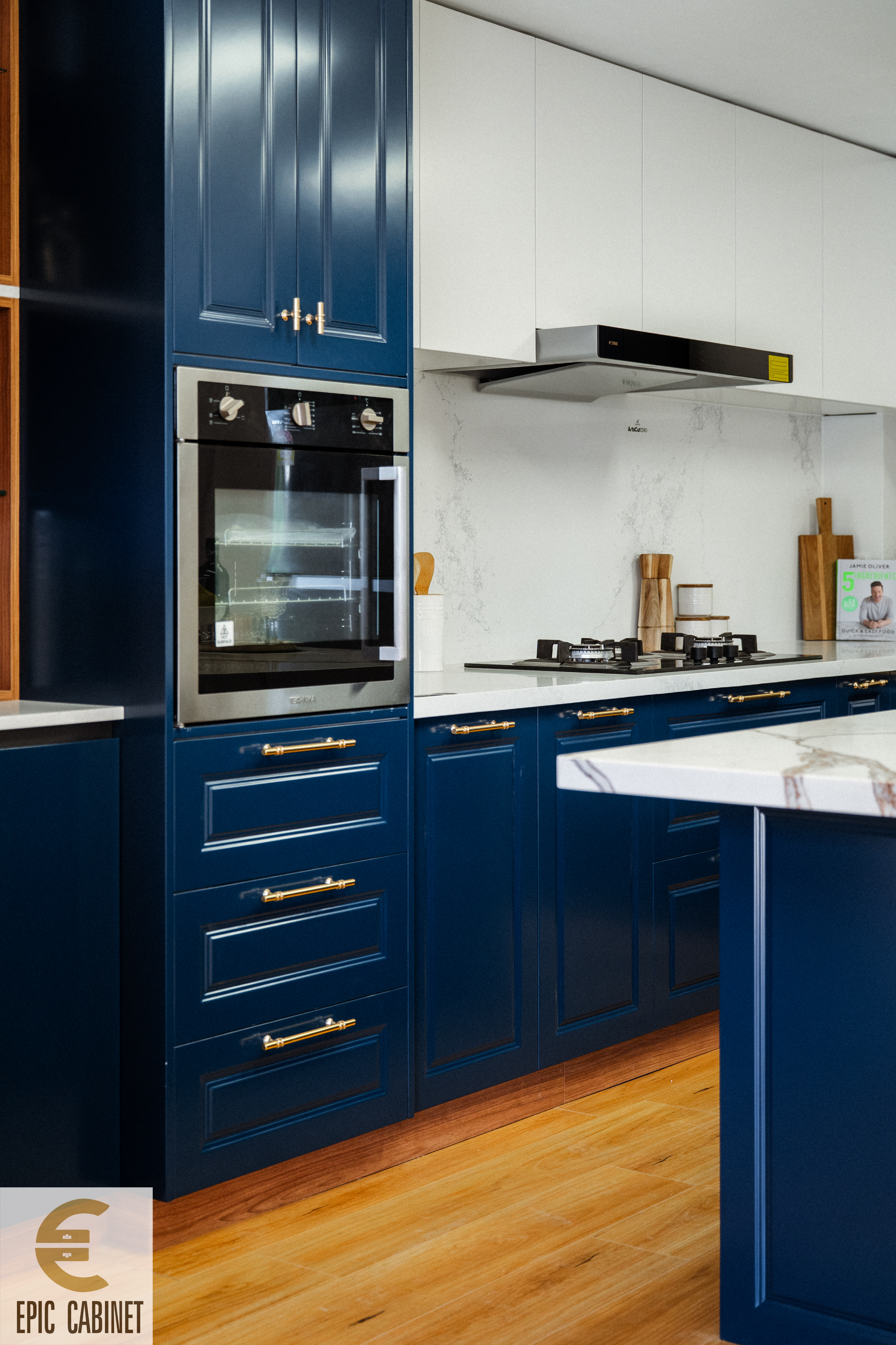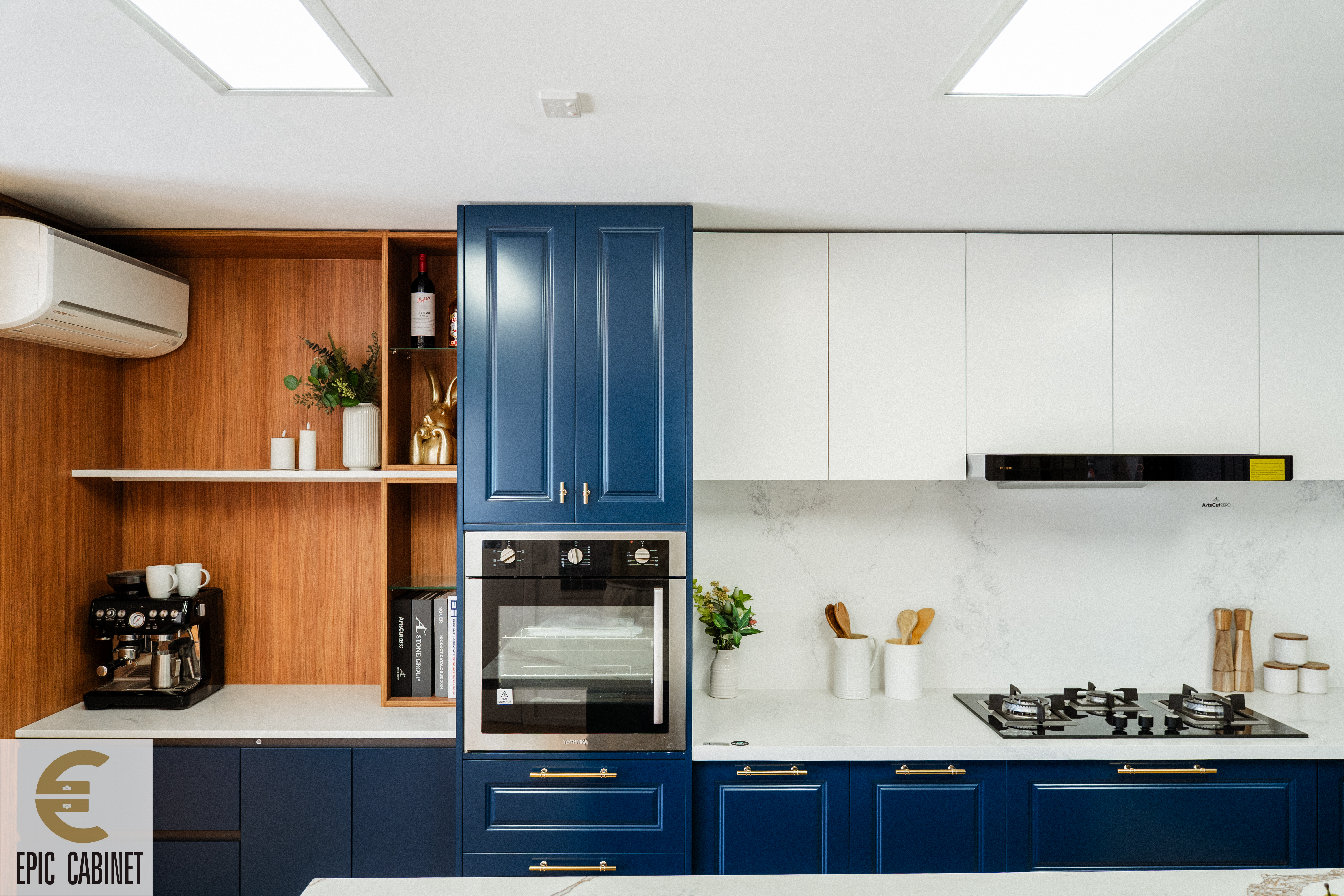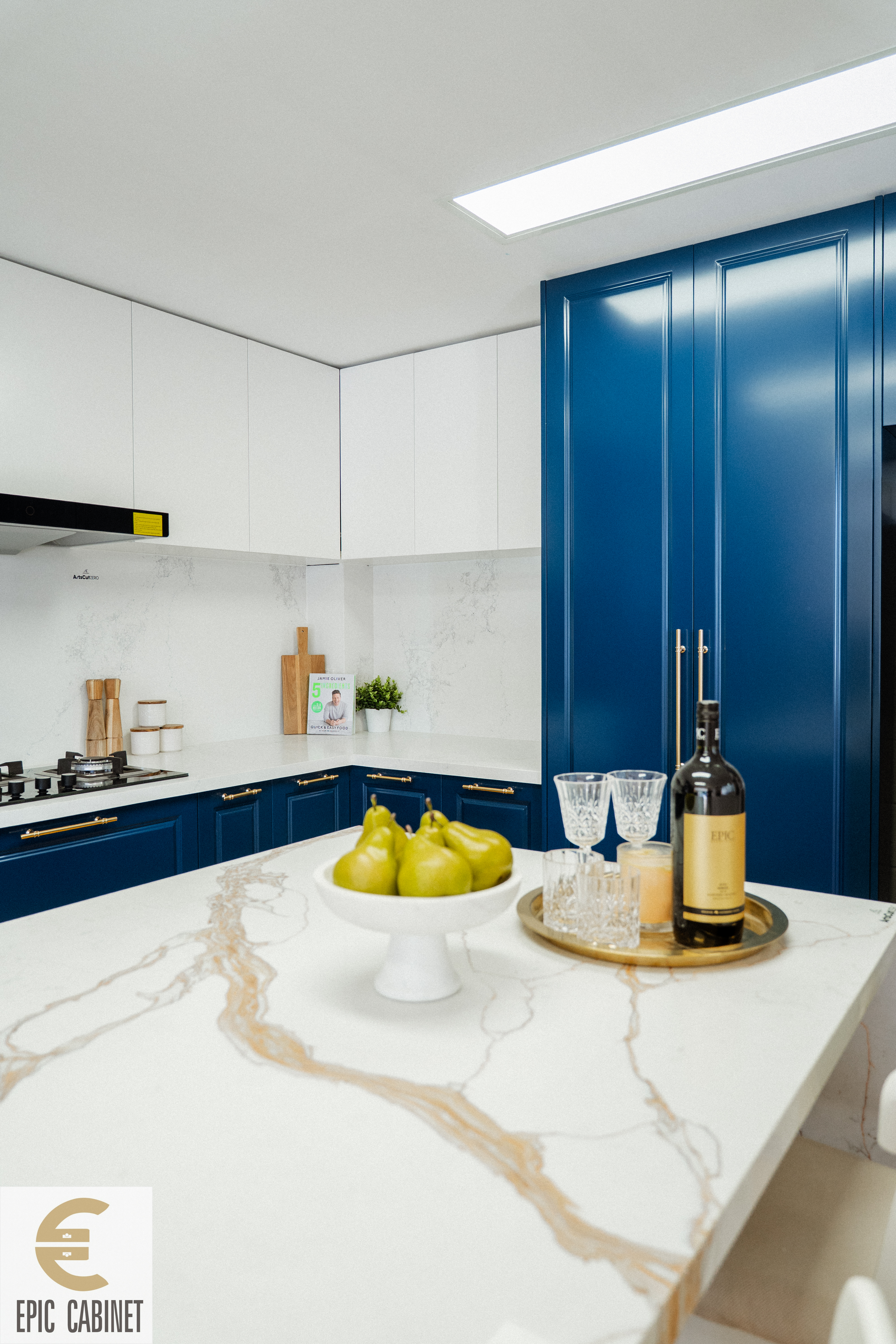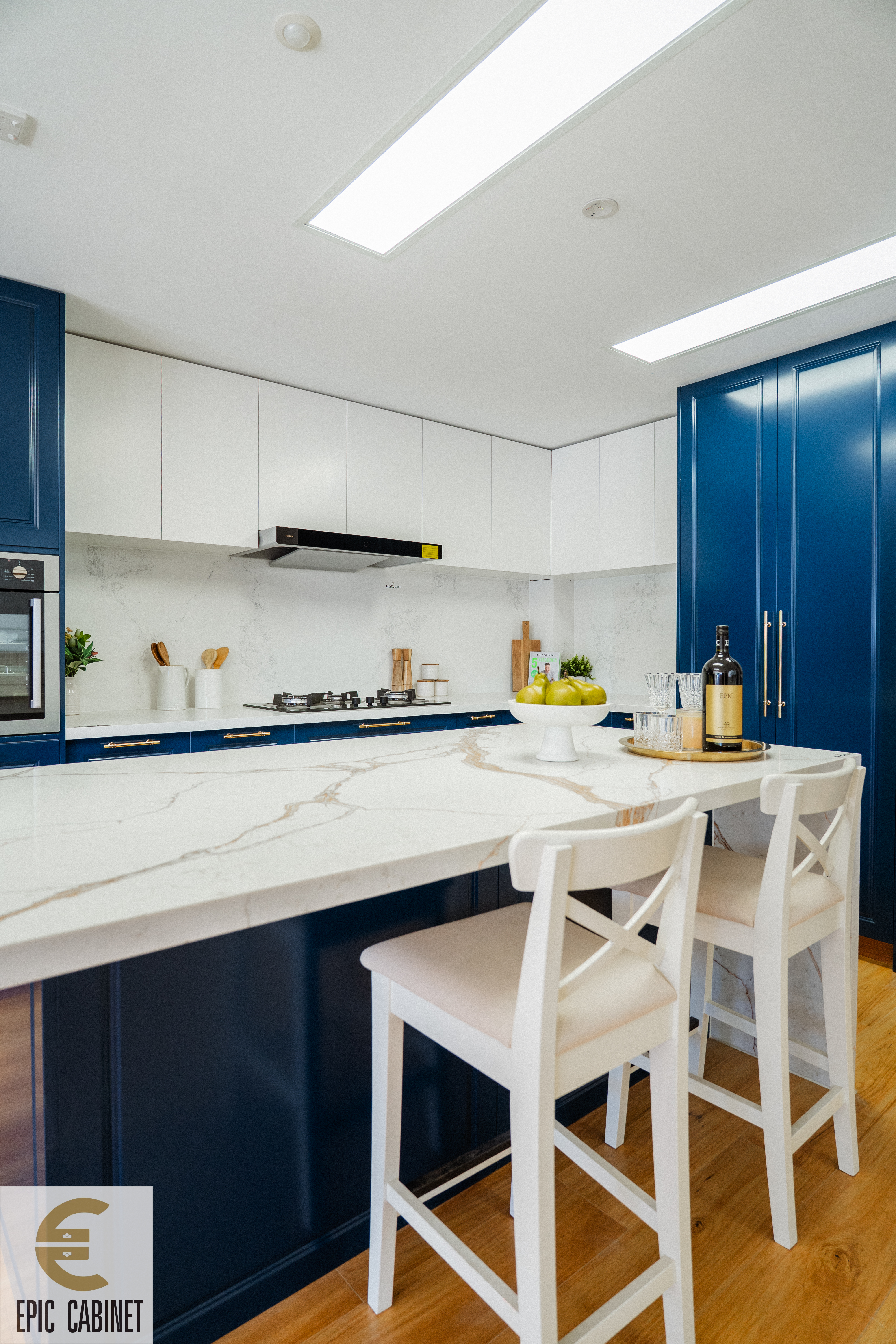 - Two-Tone Cabinetry: The kitchen has a modern look achieved by the two-tone cabinets, the contrast between the bold blue lower cabinets and the white upper cabinets giving a visually appealing effect.